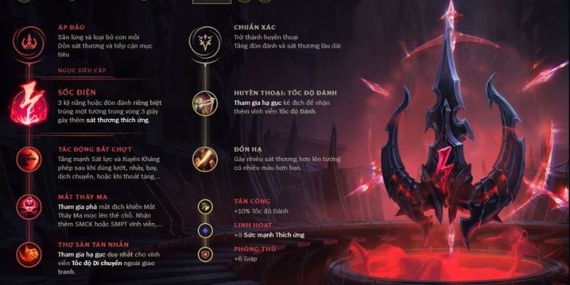 - Chuẩn xác – Trở thành huyền thoại, tăng đòn đánh và sát thương lâu dài: Ngọc siêu cấp – Sẵn Sàng Tấn Công, Đắc Thắng, Huyền Thoại (Kháng Hiệu Ứng), Nhát Chém Ân Huệ